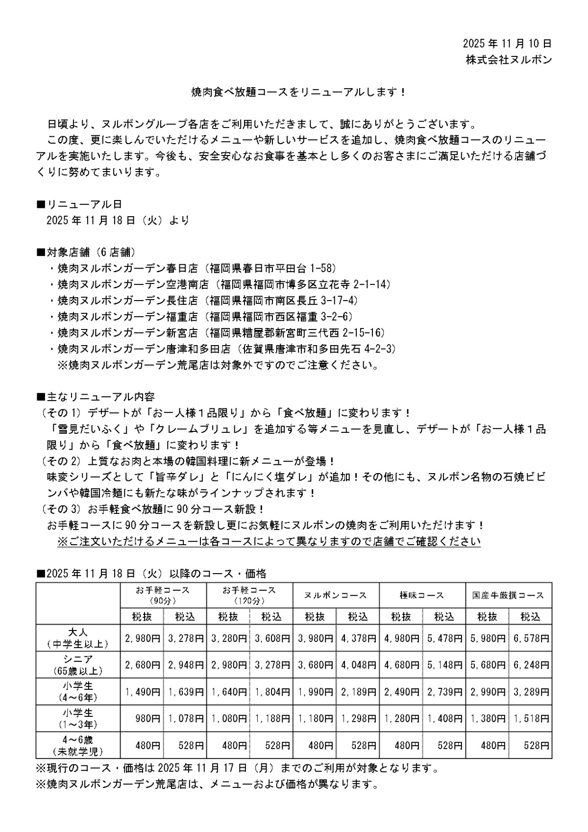 【焼肉ヌルボンガーデン】食べ放題コースをリニューアル!
