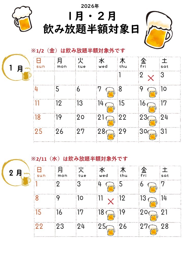 【焼肉ヌルボンガーデン】水曜日&金曜日は飲み放題半額!★1月・2月★対象日のご案内