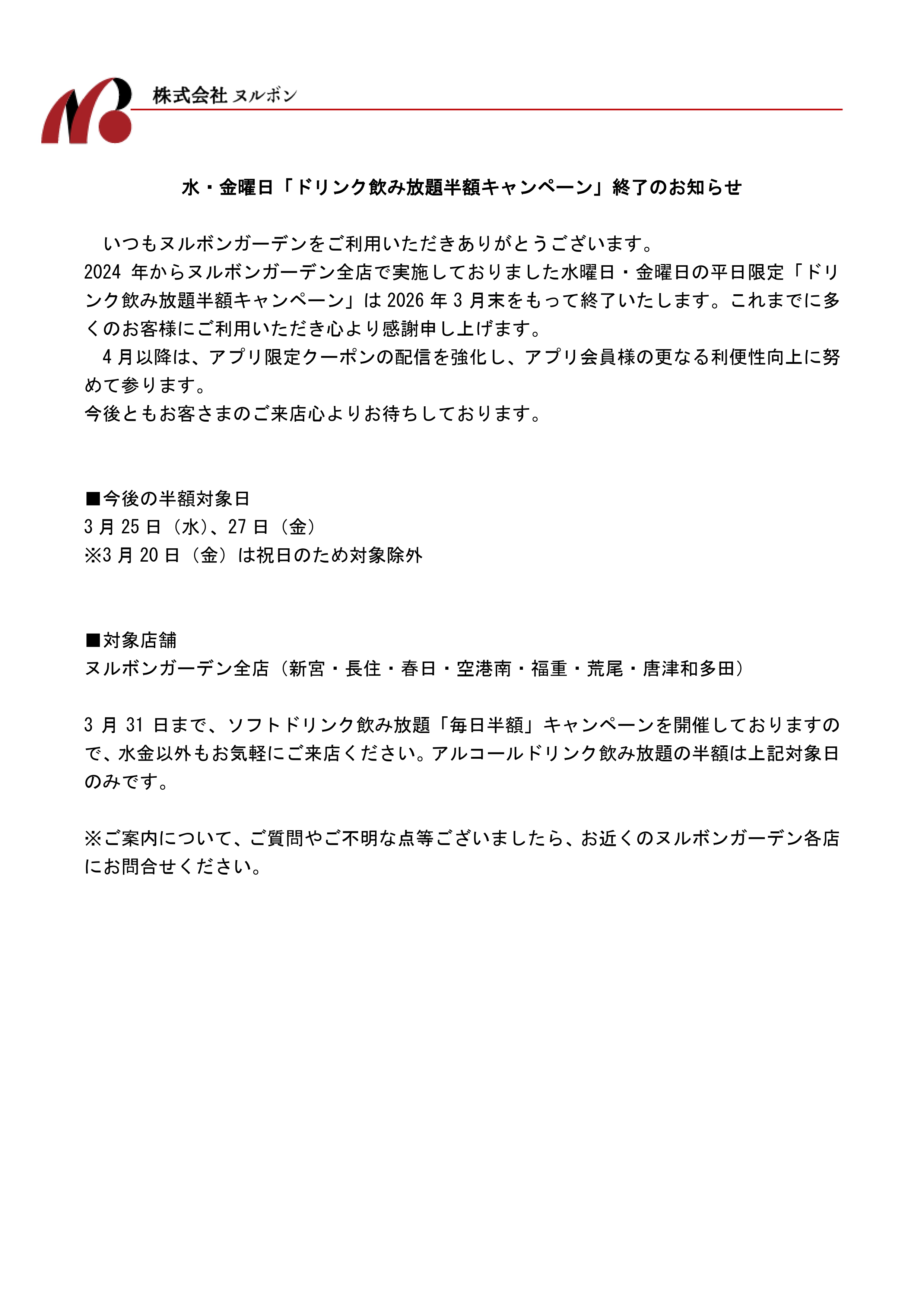 水・金曜日「ドリンク飲み放題半額キャンペーン」終了のお知らせ